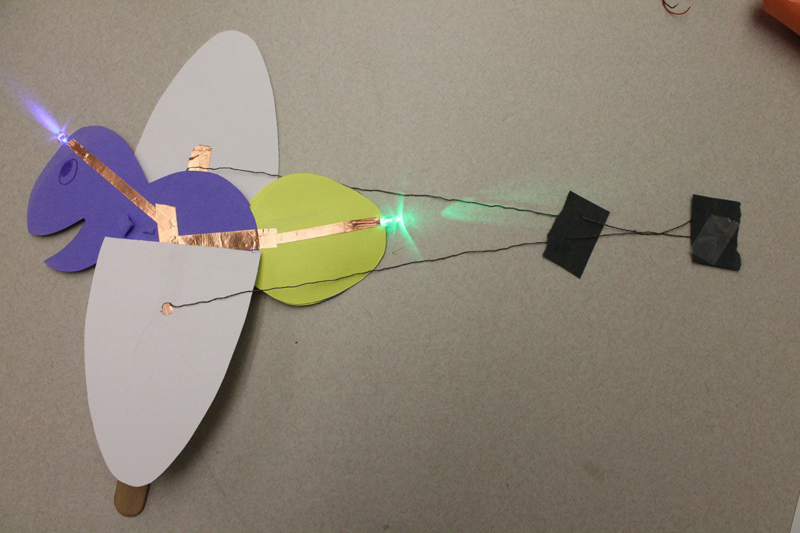 This is our most complex design, involving multiple pieces and materials. It requires two hands to control: one to stabilize and move the puppet, the other to control the wings and the light using conductive thread.