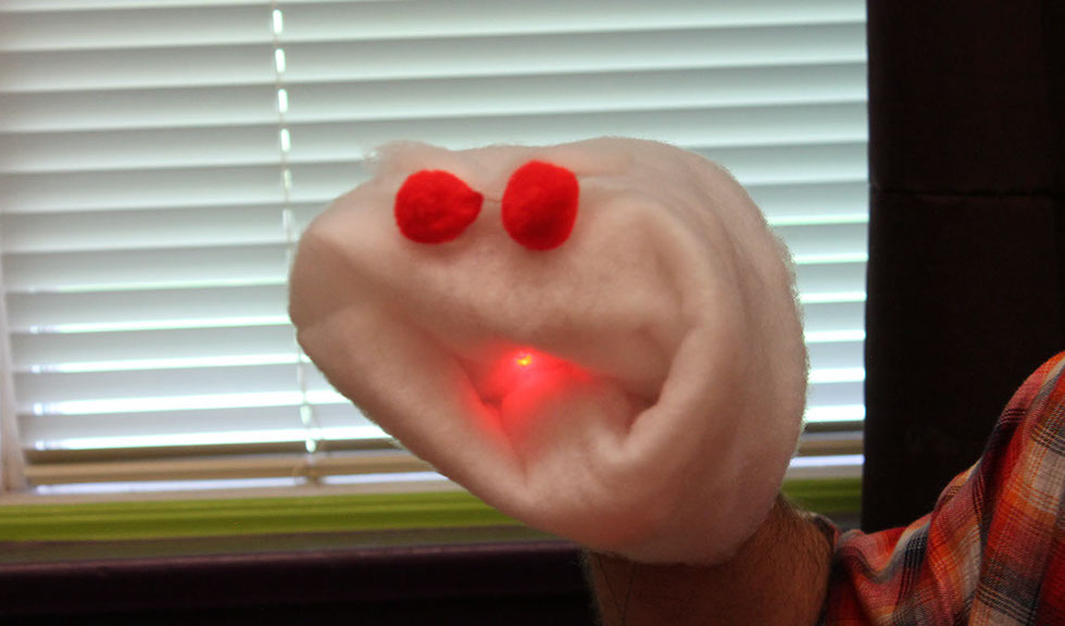 The cloud is a modified sock puppet requiring two hands to control: one to control the mouth of the puppet, and the other to turn on the light through an embedded circuit using conductive thread.